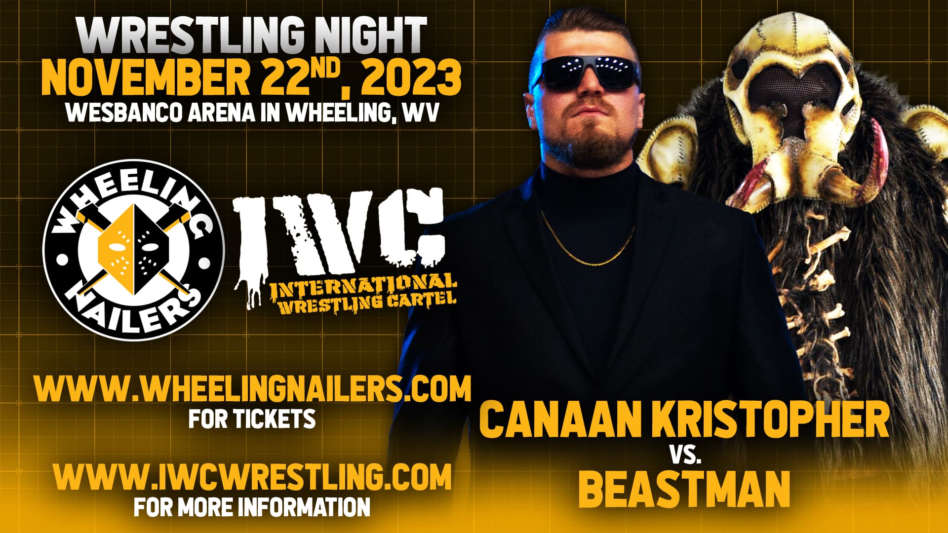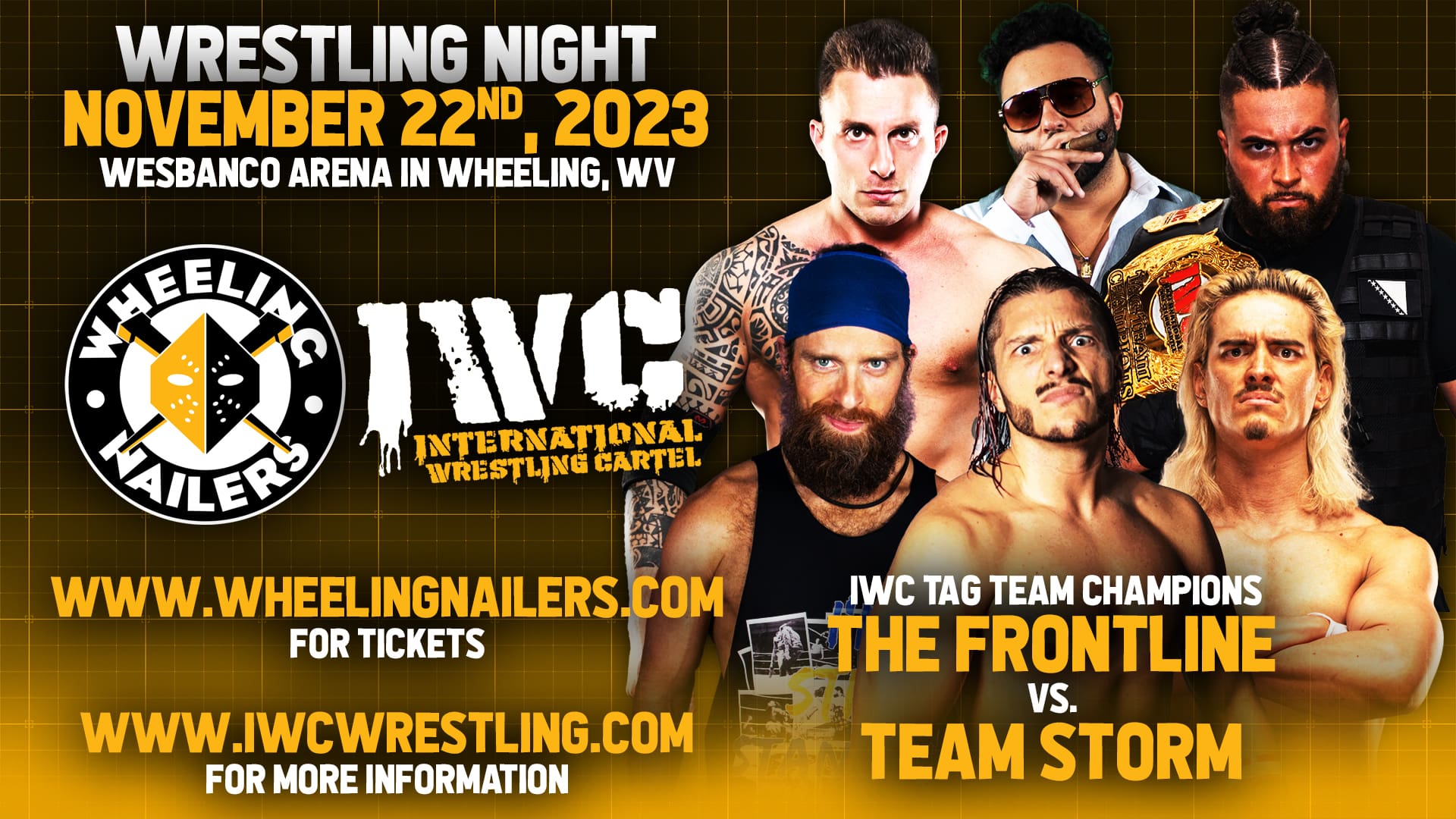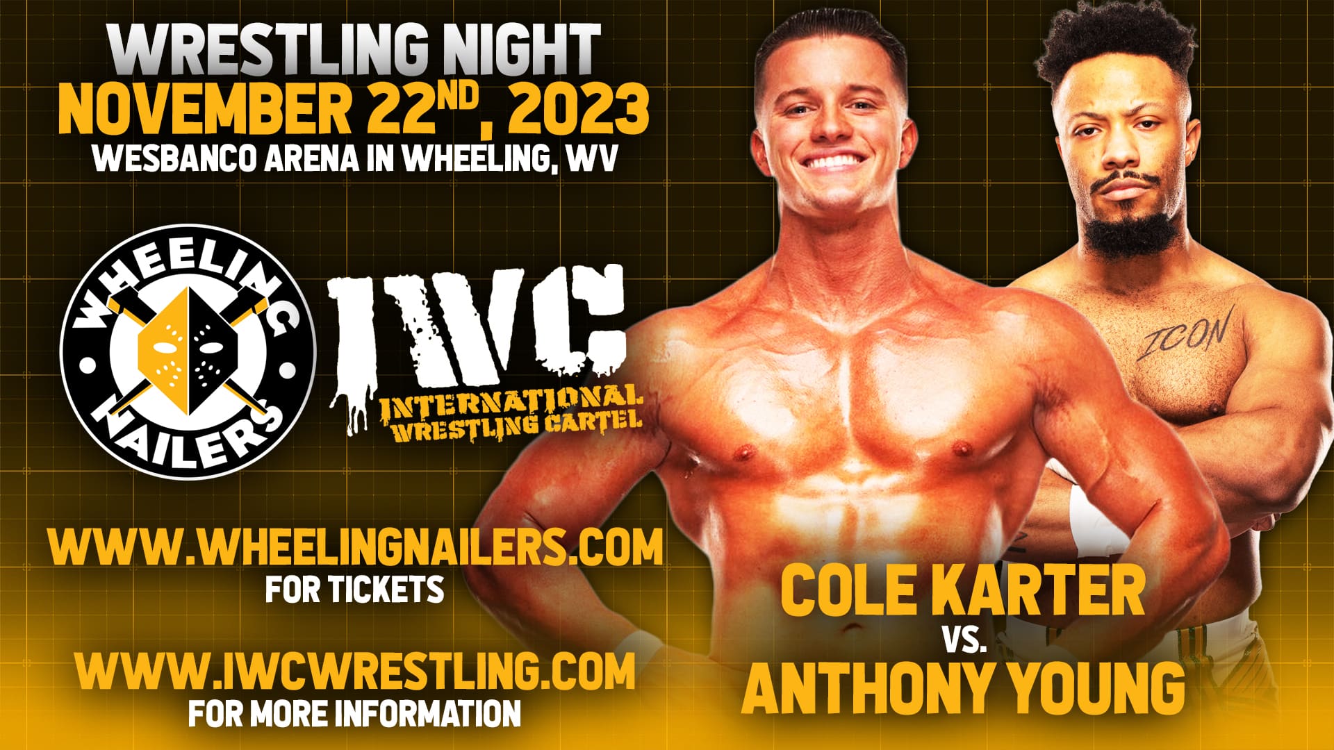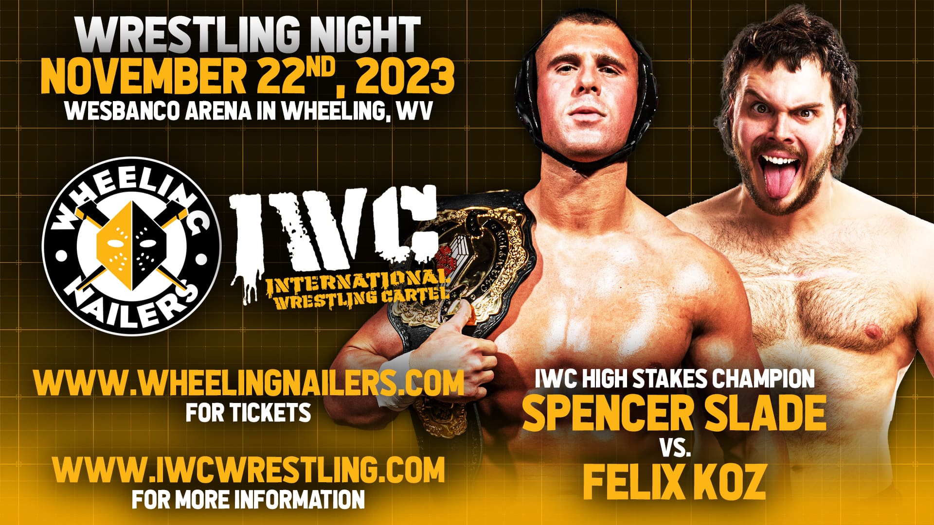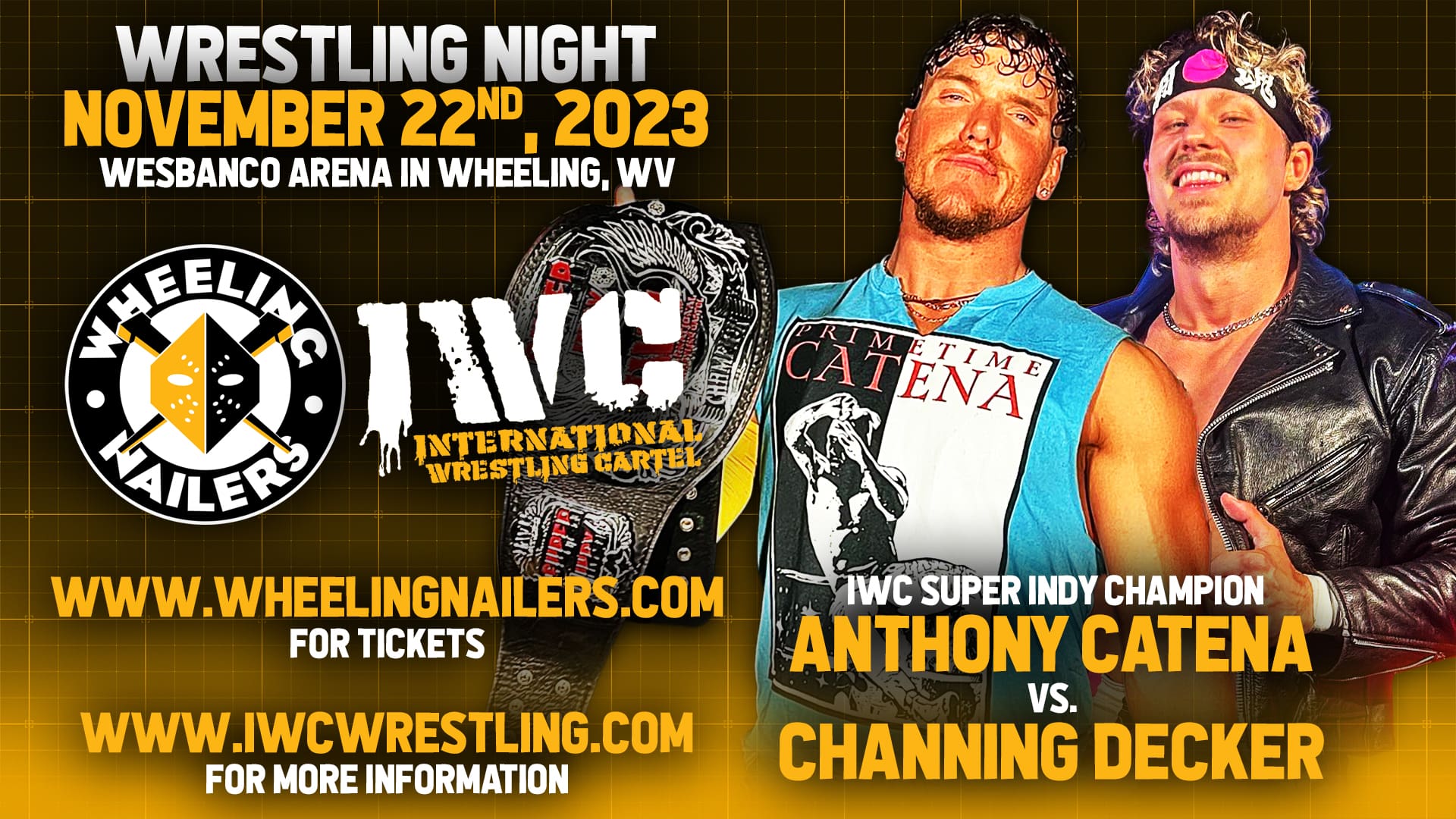 For the first time ever, IWC will join the Wheeling Nailers for their Wrestling Night event on Wednesday November 22nd, 2023 at Wesbanco Arena in Wheeling, WV! Doors open at 5:30 PM and will feature IWC wrestling in the lobby starting at 6:00 PM! Plus, a bonus match will take place during each intermission!! Tickets are on sale now at www.wheelingnailers.com and are going fast!!