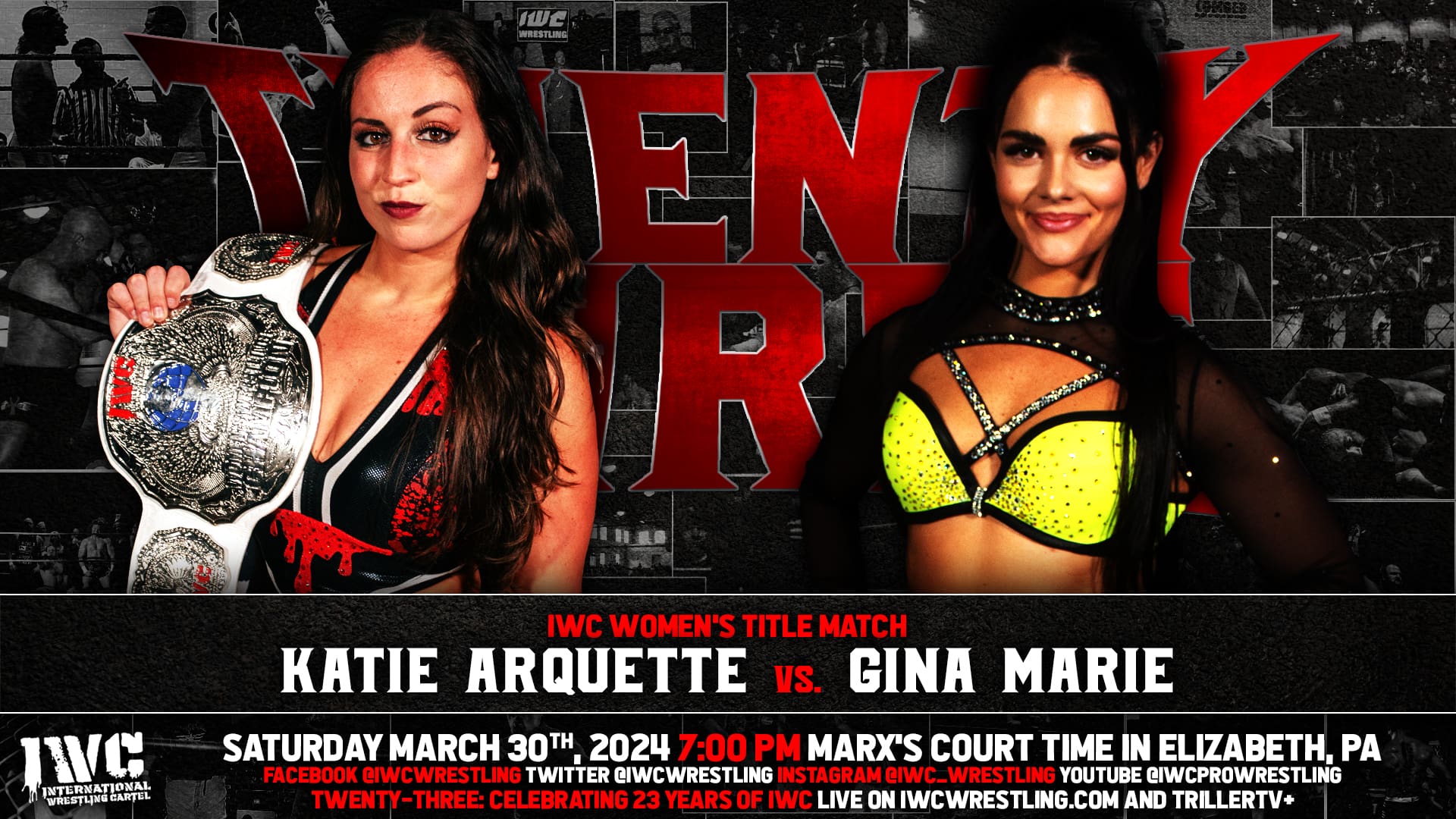 Now that Katie Arquette has made it out of Reloaded 10.0 with the IWC Women’s Championship, she sets her sights on continuing to make her mark on history. At IWC Twenty-Three, the four time champ faces a returning Gina Marie. These two had quite the “interaction” to end 2023, but now they face off one on one on March 30th for the women’s top prize. Can the Queen of the Silver Screen continue to be IWC’s leading lady? Or will Gina Marie steal her spotlight?